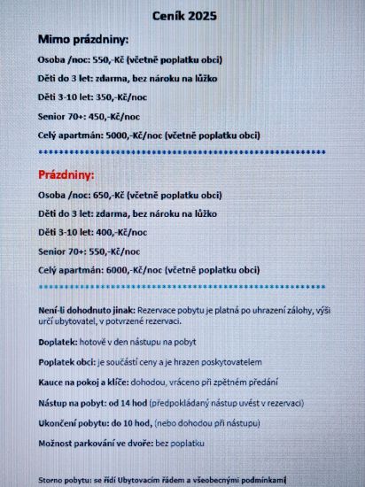 Mimo prázdniny: 550,-Kč/os/noc, celý apartmán 5000,-Kč/noc.